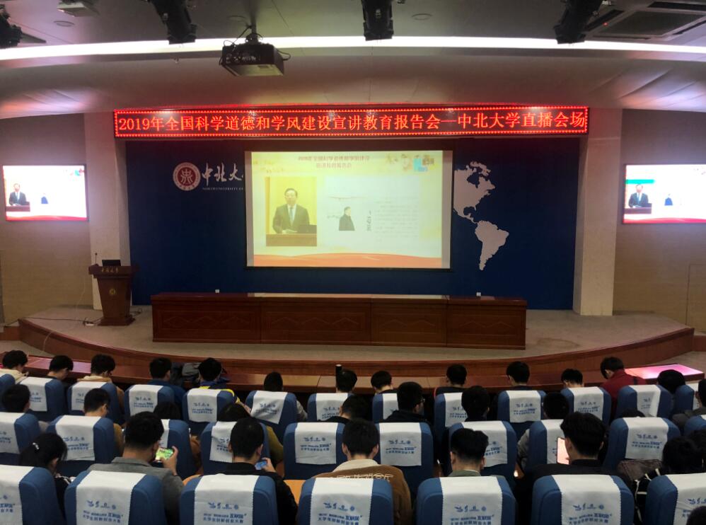 组织400名研究生在瑾瑜国际会议中心共同观看全国科学道德和学风建设宣讲教育报告会的直播盛况。